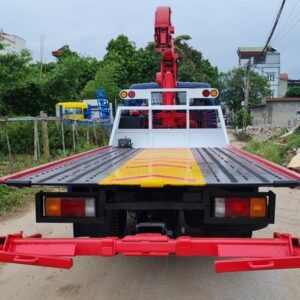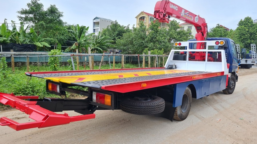 Bên cạnh cẩu và sàn trượt, xe còn được tích hợp hệ thống càng kéo thủy lực mạnh mẽ ở phía cuối xe. Càng kéo có thiết kế 2 hành trình, 2 giai đoạn (nâng/hạ và vươn/thu), làm từ thép SS400 dày 8mm, cho phép kéo các loại xe bị hư hỏng di chuyển an toàn trên đường. Với sức nâng càng kéo tĩnh lên tới 1500 kg và sức kéo trên càng khi di chuyển đạt 8000 kg, chiếc xe này có thể xử lý hầu hết các tình huống kéo xe từ nhẹ đến nặng.